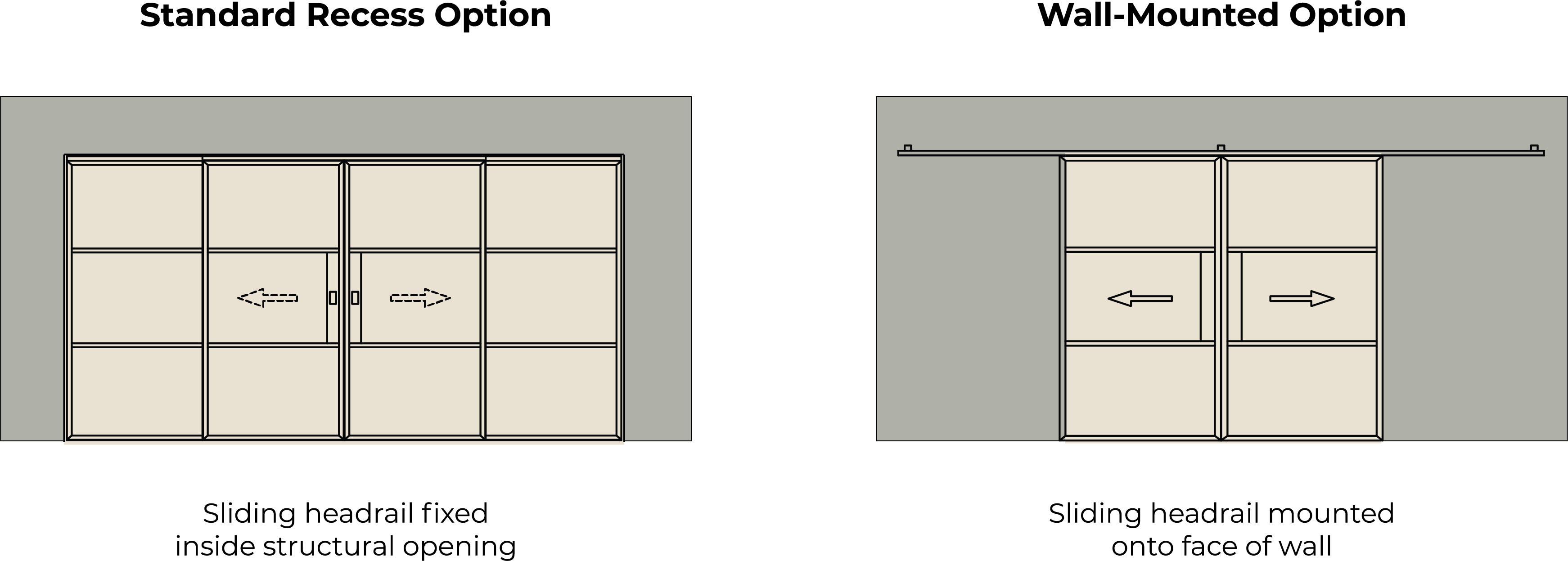 This is the more traditional setup where the sliding headrail is fixed within the structural opening — allowing the doors to glide neatly back and forth across the opening itself. It’s perfect for internal partitions with a large wide opening space like partitions between kitchens and dinning rooms.